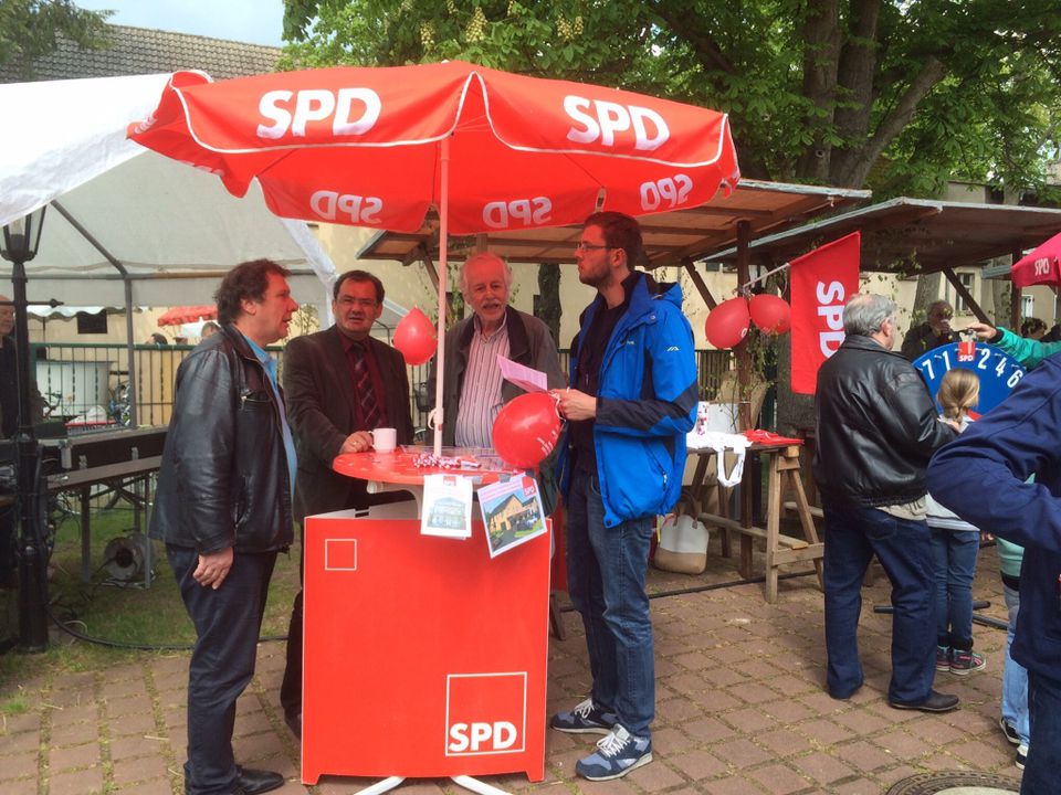 Auch in diesem Jahr beteiligte sich die SPD-Neuenhagen mit einem Stand auf dem Mai-Fest an der Arche. Zu den zahlreichen Besuchern gehörte auch der örtliche Landtagsabgeordnete Jörg Vogelsänger. Zusammen mit seinem Büroleiter Christian Stauch sprach er mit dem Ortsvereinsvorsitzenden Andre Böttner und dem Gemeindevertreter Jürgen Hitzges über den Stand der Entwicklung in der Eisenbahnstraße. Hierzu hatte die SPD große Fotos über die geplante Umgestaltung des Geländes ausgelegt sowie in einem Flyer erklärt, warum und an wem es gelegen hat, dass die Pläne in der letzten Sitzung der Gemeindevertretung gescheitert sind. Viele Bürger waren darüber enttäuscht und brachten ihre Hoffnung zum Ausdruck, dass diese Entscheidung möglichst bald revidiert wird und das Gelände endlich neu gestaltet wird.