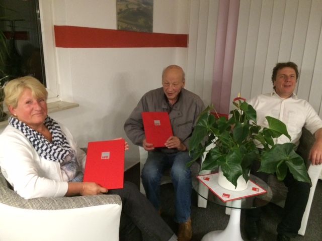 Der Ortsvereinsvorsitzende Andre' Böttner ehrt Renate Prietzel und Helmut Wehde für ihre 25jährige Mitgliedschaft in der SPD. Beide waren direkt noch der Wiedergründung der Partei in die SPD eingetreten.
