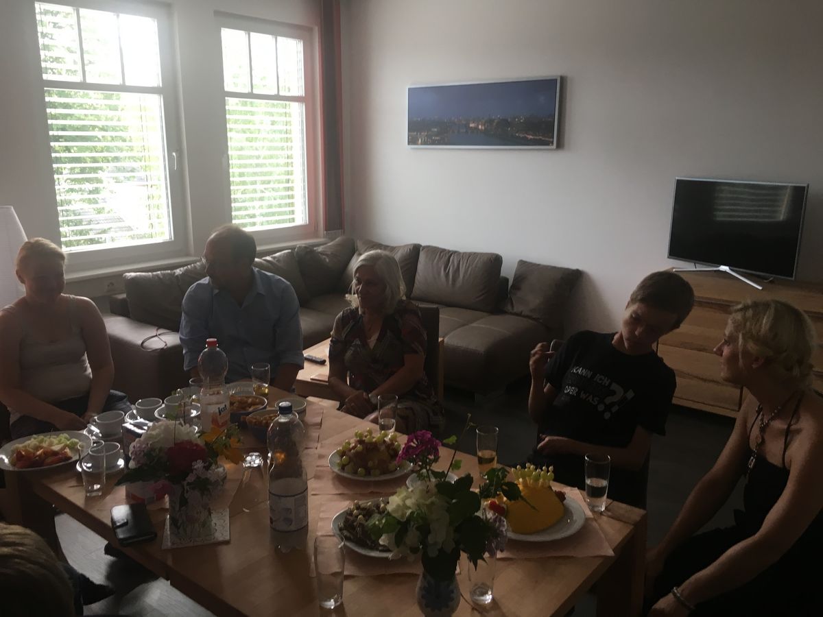 Hier überreichten Simona Koß und Stephen Ruebsam der Wohngemeinschaft das von Schülern erstellte mitgebrachte Kunstwerk, das aus lauter kleinen Zeichnungen besteht. Stephen Ruebsam konnte auf einigen Zeichnungen Orte aus Rüdersdorf, seinem jetzigen Wohnort, ausfindig machen.