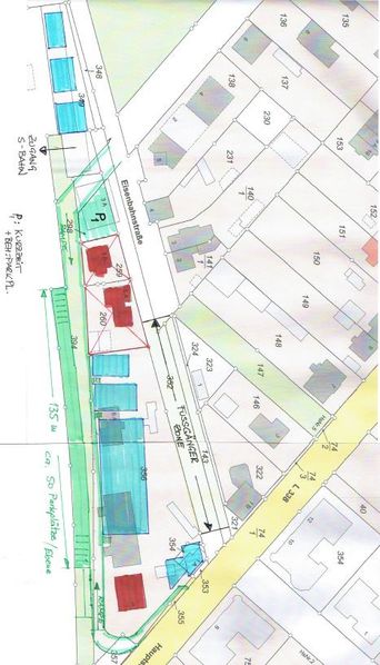 - Der ruhende Verkehr / Stellplätze kann zweigeschossig entlang der S-Bahn angeordnet werden, möglicherweise mit einem positiven Schallschutzeffekt für die nördlich davon angesiedelten Nutzungen. Die Möglichkeit einer Rechtsabbiegespur von der Hauptstr. ist zu prüfen. Fahrradabstellanlagen sollen in ausreichender Anzahl errichtet werden.
