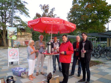 Genossen aus Neuenhagen Jürgen Ulrich und Jürgen Hitzges sowie Moritz Felgner aus Hoppegarten und Marianne Hitzges aus Neuenhagen unterstützten Olaf Mangold mit seinem Wahlkampfteam in seinem Wahlkampf zur Bundestagswahl. Mit „Coffee to go“ waren viele frühaufstehende Pendler schnell bereit zu einem kurzen Stopp zum Wahl- bzw. Kandidatenplausch. Flyer des Kandidaten, die symbolischen Mangoldsamentütchen und der nicht fehlen dürfende Kugelschreiber wechselten rasch zu den Passanten über. Bis auf einen erklärten NPD-Wähler waren dem Kandidaten im Wesentlichen offene Menschen gegenüber unterwegs.