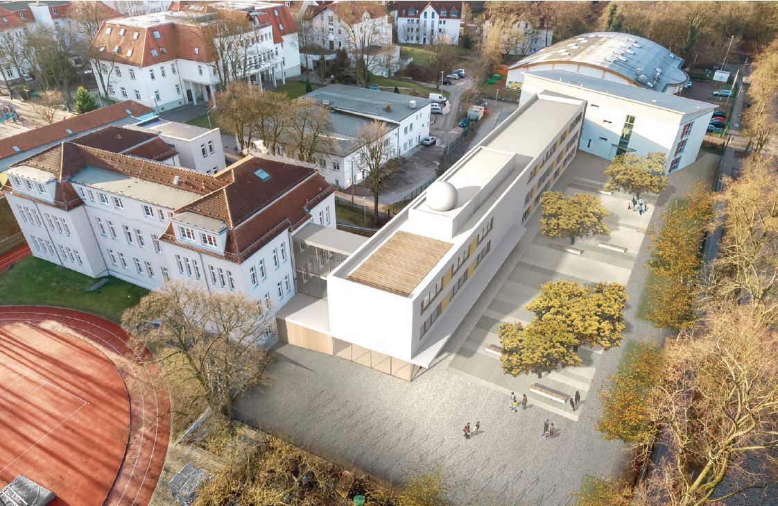 Insgesamt werden durch den Anbau 2 weitere Fachunterrichtsräume, 4 Klassenräume, ein multifunktioneller Veranstaltungsbereich, eine Mediathek, eine Dachterrasse mit Blick auf den Schulhof sowie eine Sternwarte geschaffen. Außerdem wird die vorhandene Cafeteria erweitert.