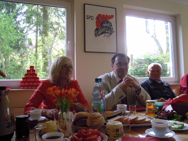 Bei einem politischen Frühstück, zu dem der SPD-Ortsverein Neuenhagen eingeladen hatte, waren zahlreiche SPD-Mitglieder, Bürger, Vertreter anderer Parteien und Initiativen sowie der Bürgermeister Jürgen Henze gekommen. Diskutiert wurden zahlreiche Fragen wie der Ausbau des Sterns, der Radweg von Neuenhagen nach Hönow, der Regionalhaltepunkt in Hoppegarten und der Ausbau der Parkplätze am Bahnhof, das geplante Hallenbad. Der Minister informierte über die notwendigen Sparmaßnahmen des Landes, den Streit zwischen den Ländern Berlin und Brandenburg um den Regionalhalt in Hoppegarten oder Mahlsdorf, und dass es keine Landesförderung für ein Hallenbad gibt. Von daher konnte er keine, der dringend geforderten Infrastrukturmaßnahmen in Neuenhagen bzw. dem Mittelzentrumsbereich Neuenhagen zusagen. Er verwies aber darauf, dass die betroffenen Gemeinden auch Maßnahmen in Eigenregie übernehmen können. So nannte er die Möglichkeit einer Trennung von Aufgaben und dass Neuenhagen und Hoppegarten den Radweg nach Hönow bauen können und für den Unterhalt zuständig wären. Zum Schluss sagte er der Ortsvereinsvorsitzenden Marianne Hitzges zu, mit ihr gemeinsam S-Bahn zu fahren, um die Situation um Parkplätze und Platzangebot in den Bahnen zu prüfen. Auch wenn es keine Geschenke gab, dankt der SPD-Ortsverein Neuenhagen dem Minister Vogelsänger für seinen Besuch und die offene und informative Veranstaltung.