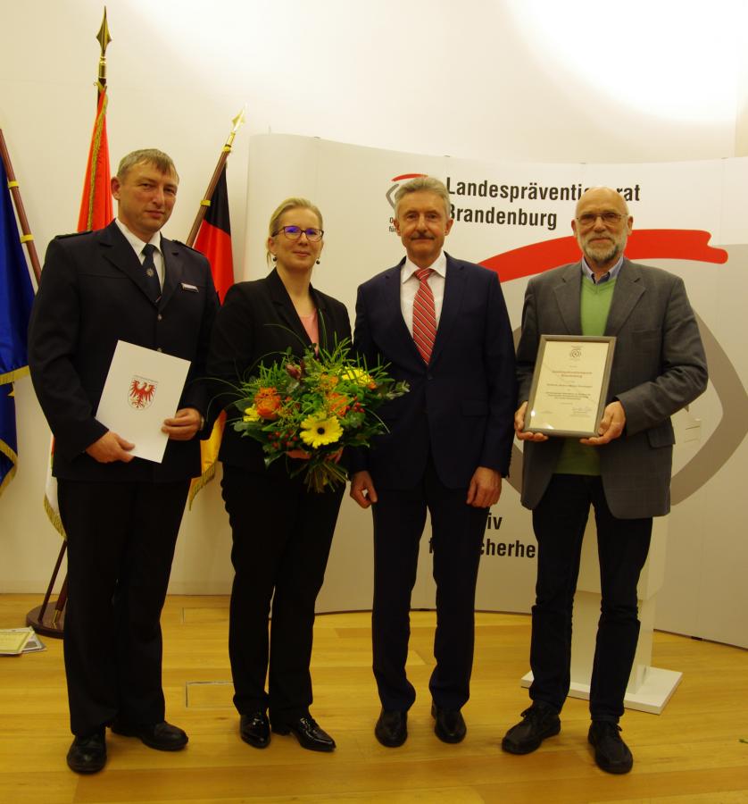 Innenminister Karl-Heinz Schröter (2. v. r.) übergab den Landespräventionspreis Brandenburg an Janina Meyer-Klepsch, Sie Das Netzwerk „Sichere Adresse Neuenhagen“ ist am Mittwoch in Potsdam vom Landespräventionsrat mit dem Landespräventionspreis Brandenburg ausgezeichnet worden. Innenminister Karl-Heinz Schröter überreichte den mit 2000 Euro dotierten Preis stellvertretend an Janina Meyer-Klepsch, zuständige Fachbereichsleiterin in der Neuenhagener Gemeindeverwaltung, Siegfried Leschinski vom Siedlerverein Neuenhagen-Gartenstadt und Sven Brandau, Leiter der Polizeiinspektion MOL. Sie alle sind neben weiteren Vereinen und Gewerbetreibenden aus Neuenhagen Netzwerkpartner des seit 2013 bestehenden Projekts zur kommunalen Kriminalitätsverhütung.