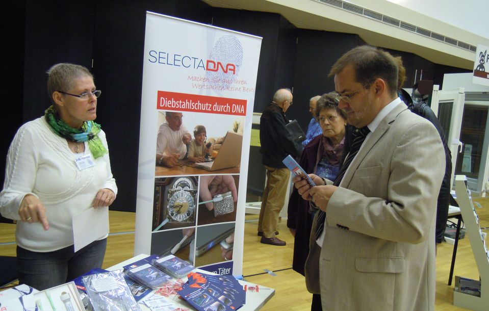 Der Landtagsabgeordnete Jörg Vogelsänger informierte sich u.a. am Stand zur künstlichen DNA. Dort wurde mit einer Codierung für die PKW-Frontscheibe geworben, die auch in der KFZ-Zulassung eingetragen wird und bei jeder Polizeikontrolle schnell Ungereimtheiten sichtbar macht. „Das installiere ich in meinem neuen Pkw auch“, so Jörg Vogelsänger überzeugt von diesem Angebot.