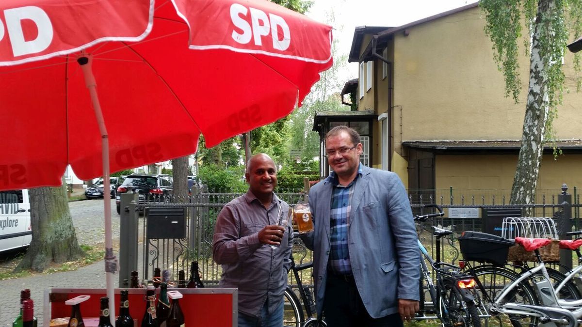 Annähernd 30 SPDler sind seiner Einladung gefolgt, obgleich die Rechnung mit dem schönen Wetter nicht ganz aufging. Auch prominente Gäste wie der Bürgermeister Jürgen Henze aus Neuenhagen, Ravindra Gujjula und seine Frau Gabriele Gujjula aus Altlandsberg, Stefan Radach aus Birkenstein und Stephen Ruebsam aus Rüdersdorf besuchten das Fest.