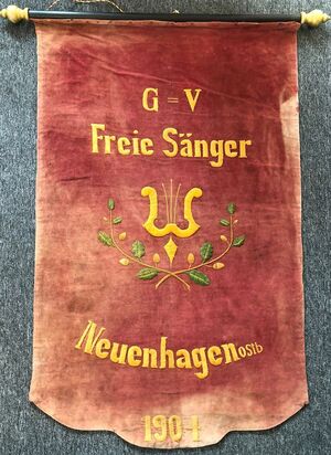 Die wechselvolle Geschichte dieser Fahne begann 1904 in Neuenhagen bei Berlin. Sangesfreudige Männer hatten sich vermutlich im „Gasthof Wolter“ gegenüber vom Bahnhof Neuenhagen an der Ostbahn getroffen, um das Erkennungsmerkmal ihres Gesangvereins „Freie Sänger“ einzuweihen. Stolz präsentiert wird eine 1m x 1,40 m große Hängefahne aus rostrotem Samt, die wahrscheinlich den wertvollen Charakter der Fahne zum Ausdruck bringen sollte.