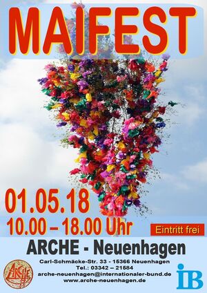 Die ARCHE-Neuenhagen lädt am 1. Mai herzlich zum traditionellen Maifest ein. Das Maifest, ein Familienfest mit vielen tollen Angeboten für Kinder (Streichelzoo der "Rollenden ARCHE", Kinderschminken, Korbflechten, Basteln, Hüpfburg, Karussell, Graffiti, u.s.w.), einem vergnüglichen und abwechslungsreichen Bühnenprogramm sowie mit diversen kulinarischen Köstlichkeiten vom Grill, aus Topf und Pfanne, leckerer Maibowle und selbst gebackenem Kuchen. Das Maifest wurde vor gut 18 Jahren durch die Ortsverbände Neuenhagens initiiert und findet seit dem jährlich statt. Auf dem Hof der ARCHE-Neuenhagen präsentieren sich die politisch organisierten Ortsverbände Neuenhagens, die Gemeinde Neuenhagen, der Ortsverband Nabu-Neuenhagen, die Engagierte Stadt Gemeinde Neuenhagen sowie die ARCHE-Neuenhagen.