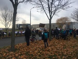 Hunderte Schüler, Eltern und Lehrer demonstrierten für den Erhalt des Zebrastreifens an der Wiesenstraße vor der Lenne-Schule in Hoppegarten.
